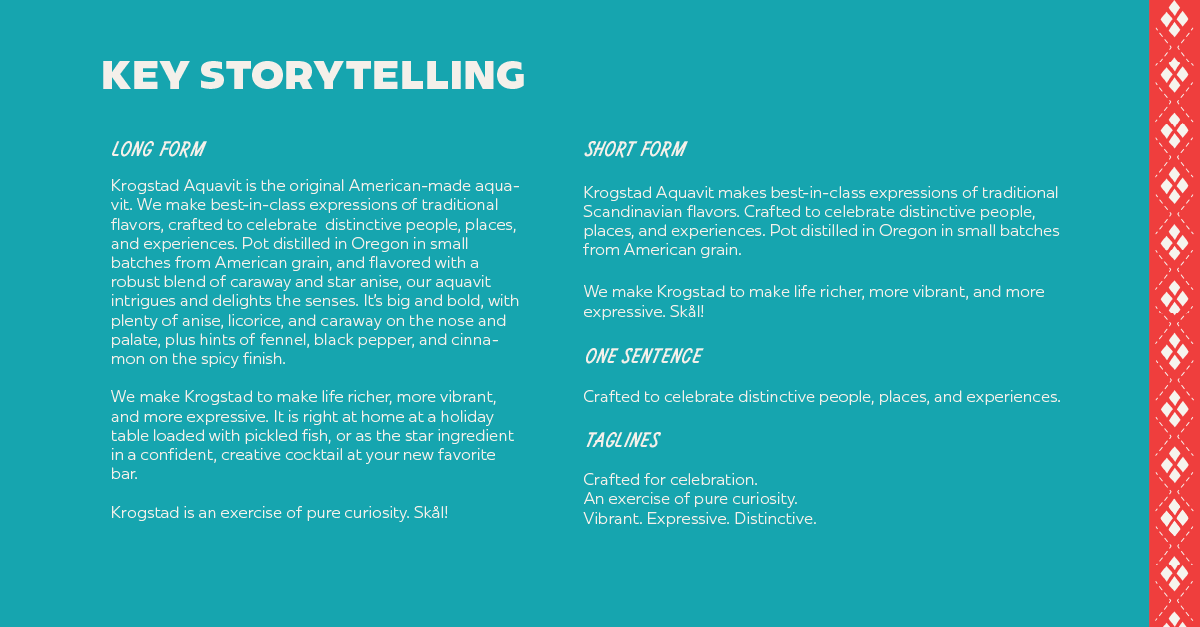 Krogstad Aquavit is the American aquavit—the first to be distilled stateside in 2006, bringing a somewhat obscure spirit to the American bar. In gearing up for their 20th anniversary, I worked closely with owners Christian and Christina to develop a brand identity to take them into the coming decades. We wanted to: